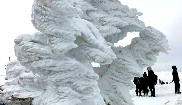Во-первых, вид одновременно на снежную вершину и на зеленую долину. Во-вторых, снег и ветер превращает любой столб в Арт-объект. Инстаграм наполняется за пару секунд.